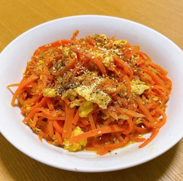 海鮮丼にもう一品加えたいなら、にんじんしりしりはいかがでしょうか。常備していることも多い、にんじんと卵があればできるので、急遽思い立ったときにも作れます。