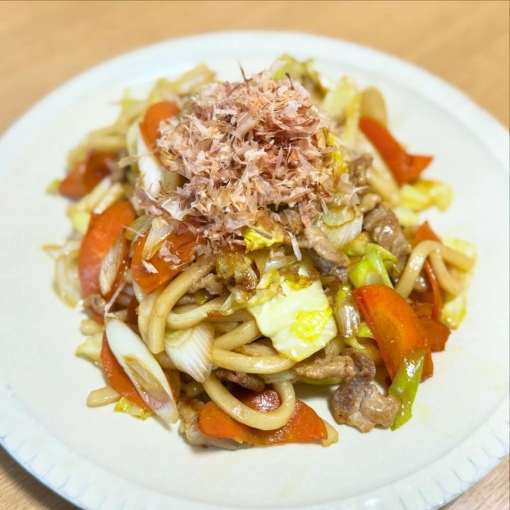 海鮮丼だけではボリュームと栄養が足りない、育ち盛りの子どもやパパがいる家庭には、焼うどんがおすすめです。野菜や豚肉でまんべんなく栄養が摂れ、ボリューミーな献立が完成しますよ。