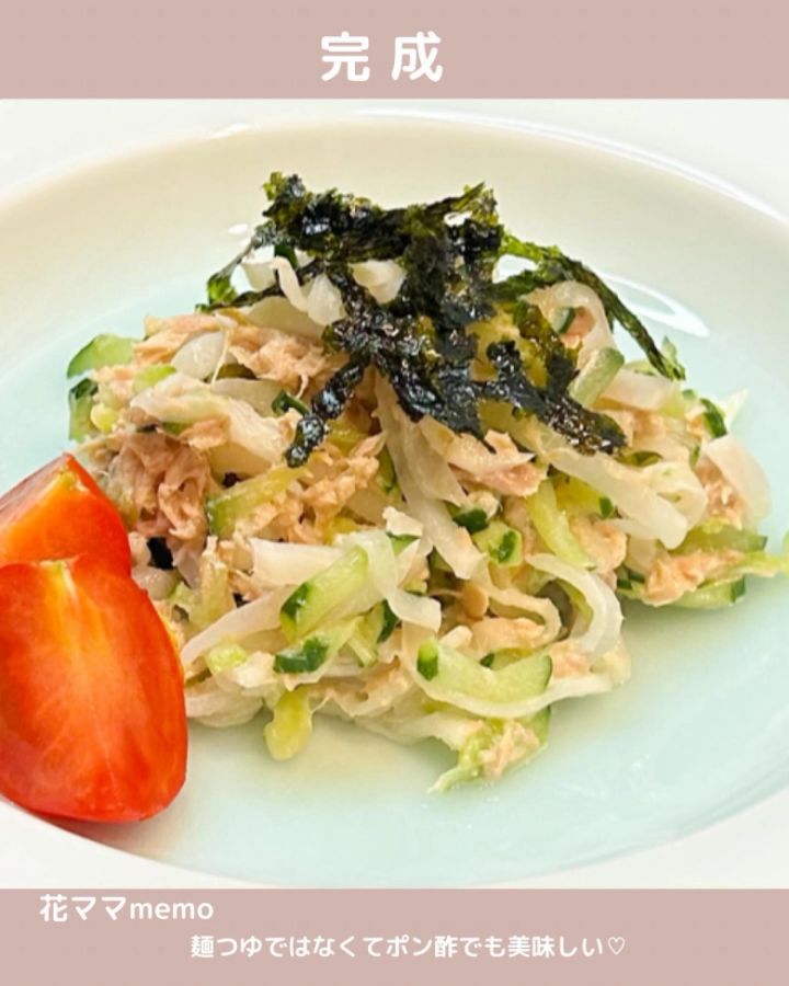 みずみずしい大根ときゅうりを細切りにしたサラダは、たくさん野菜を食べたいときにぴったりの副菜。海鮮丼の味を邪魔しないシンプルな味付けですよ。