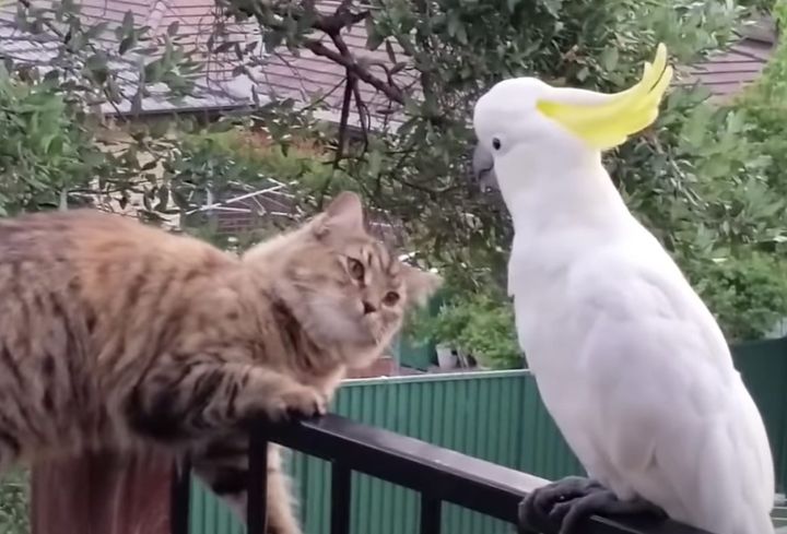 仲良くなれそうな予感? 鳥さんの頭が気になる猫。