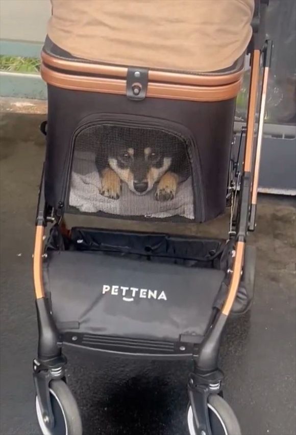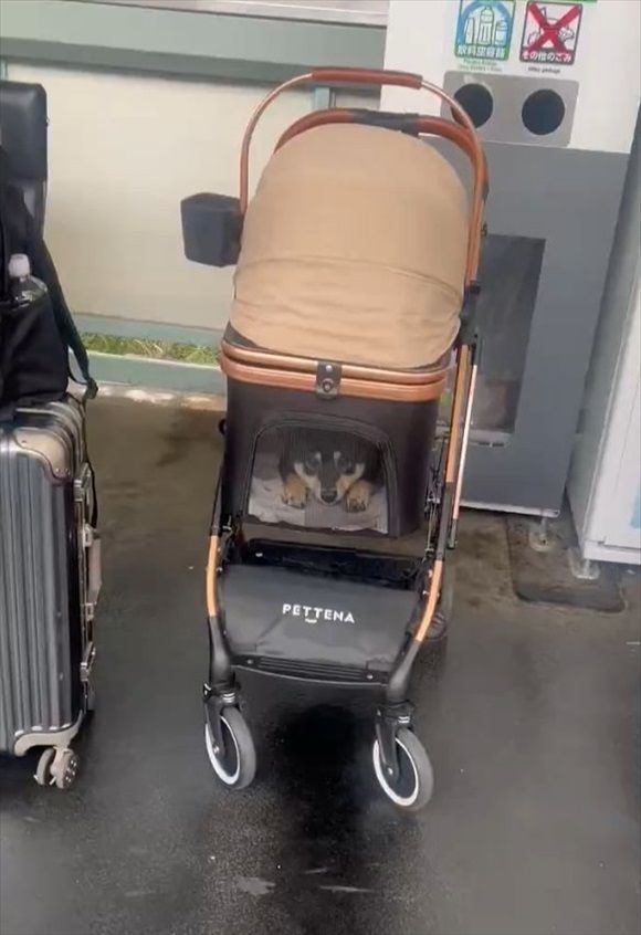 ペット用キャリーの中にいるのは、黒豆柴『ごま』ちゃんです。