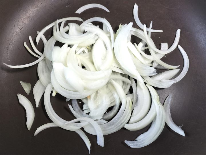 1.  フライパンに太白胡麻油と玉ねぎを入れ、中火で炒めます。