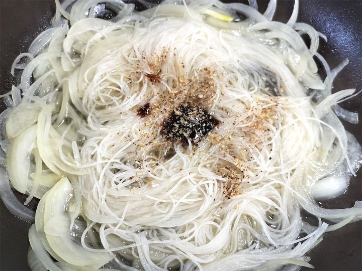 4.  ビーフンをほぐしてからオイスターソースと花椒を加えて混ぜ、味をみてもう一度フタをしてさらに2分煮ます。