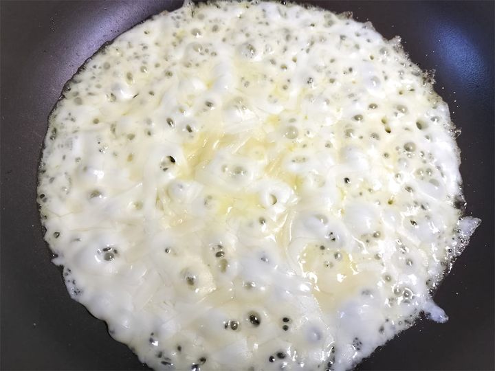 7.  弱火で加熱して、そのまま動かさずにチーズが溶けて泡立つのを待ちます。