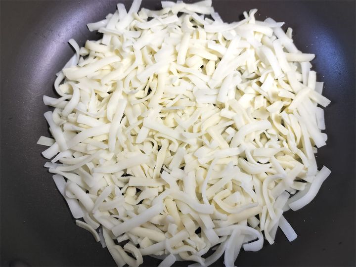 フライパンが2つ必要ですが、なければビーフンをいったん皿に移しておけば大丈夫です。問題はフライパンの大きさで、火を入れる前にチーズを円形に敷き詰めるので、できればその円形に丁度いいフライパンだと簡単です。しかも裏返すので、広がりすぎなく大きすぎないフライパンがおススメです。