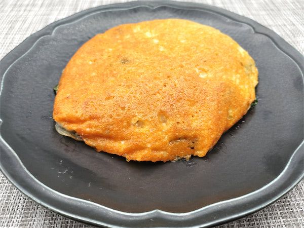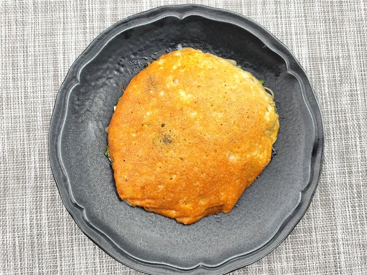 9.  シリコンベラなどでチーズをフライパンからはがし、全体が動くようになったらチーズの面が上になるように皿の上にひっくり返して盛り付けて、出来上がりです。