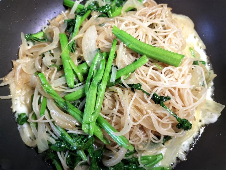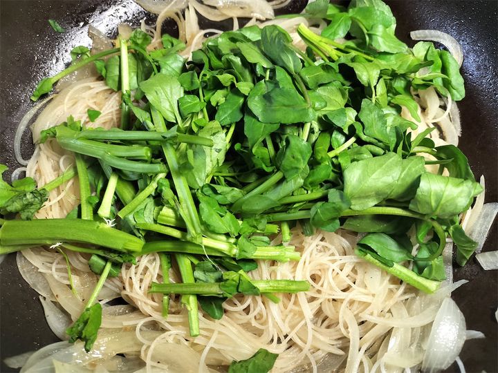 5.  クレソンを手でざっくりとちぎって入れ、水分を全部ビーフンに吸わせるように混ぜながら炒めます。