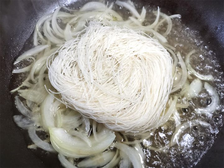 3.  沸騰したらビーフンを入れてフタをして、中火でまず2分煮ます。
