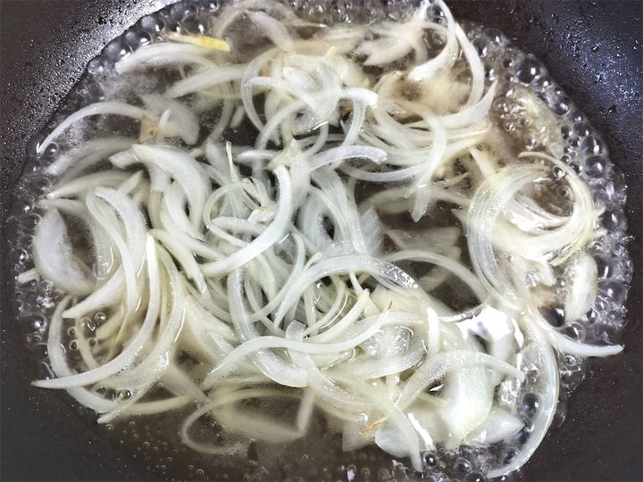 2.  油が玉ねぎ全体に回ったら、紹興酒と水190ml(分量外)を加えて強火で沸騰させます。