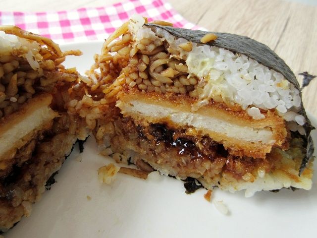 情報量が多すぎる見た目ですね。おにぎりからはみ出た焼きそば。ちらっと脇から飛び出る豚カツ。ヘビー級の高カロリーな料理が、ぎゅうぎゅうに詰め込まれていますね。見た目からして充実した食べ応えがありそうです。できることならばカロリーとは、友好関係を築ける仲になりたいものですね。