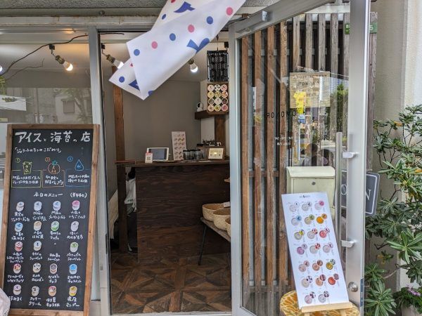 アイスを食べ終わった頃に、店主さんが「味海苔の試食をどうぞ」と紫蘇わさび・ゆず七味・梅ポンズの3種類の食べ比べをさせてくださいました。職人さんの手作りによる味付け海苔です。おいしいです。