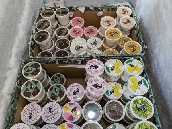 ナチュラルアイスの種類は豊富です。パッケージがおさるさんとその素材にあったデザインがキュートです!おっと、どんどんお客様が増えてきました。るなるなも並びます!