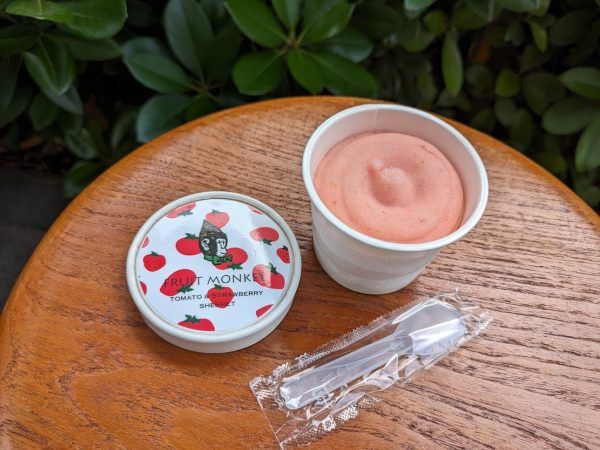 山鹿のトマトと苺のシャーベット 440円 シャーベットもあったので、もう1個食べることにしました。果肉たっぷりの熊本県山鹿産のトマトといちご!やさしい甘みと酸味が絶妙です!アイスクリームの種類がたくさんあるので可愛らしいお店に通う楽しみが出来ますね!
