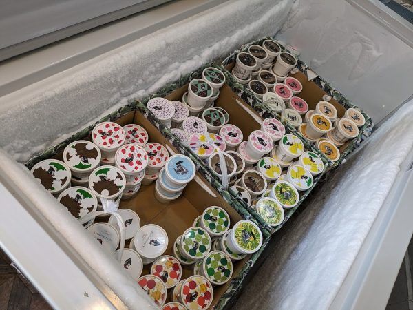 冷凍庫の中には、たくさんのアイスクリーム!これはめちゃめちゃ可愛い!このアイスの3つのこだわりは、「1、阿蘇の大自然で育ったジャージー牛の新鮮な牛乳を使用 2、旬の新鮮な果実と野菜がたっぷり 3、阿蘇白川水源の湧水を利用した天然のおいしさ」だそうです。