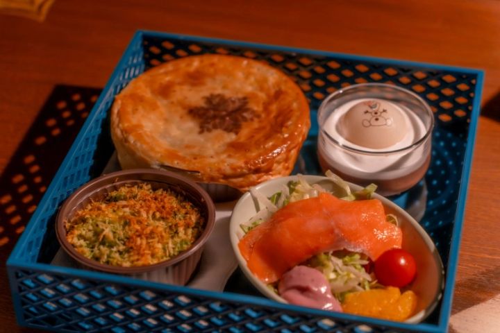 フードメニューの「アレンデールロイヤルセット(ビーフ)」のメインは、牛肉のパイ包み焼き!お城の中で楽しむグルメなだけあり、高級感がありますね。セットでスモークサーモントラウトがついているのが、アレンデールらしさを感じます!
