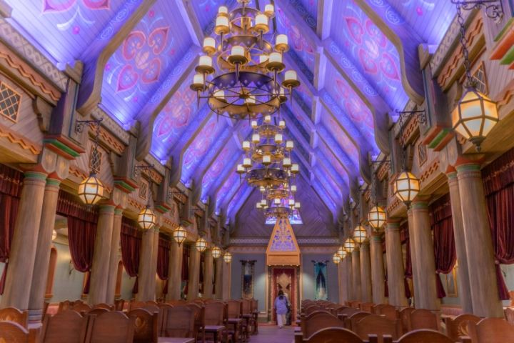 こちらは、映画でエルサの戴冠式が開かれた大広間。とても広々としていて、まるで本物のお城みたい!天井の華やかでカラフルな柄がアレンデールらしくてかわいいですね♡