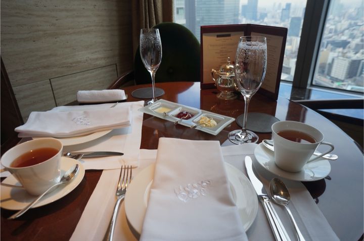 アフタヌーンティーが楽しめる「ザ ・ロビーラウンジ」は28階にあります。東京都の木・イチョウの葉をモチーフにしたクリスタルガラスのシャンデリアが輝く豪華なバーカウンターを中心に、英国アンティーク調のテーブルセットが並び、非日常の華やかさと、しっとりとした落ち着きが共存しています。