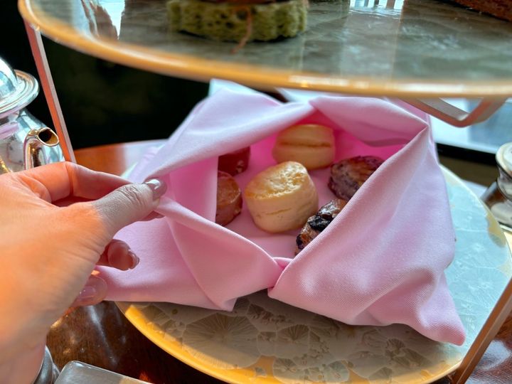 そしてこの3段目は、3種類の小ぶりなスコーンがあたたかい状態で保たれるように、ナフキンで包まれているんです! 細やかな心遣いならではのひと工夫です。外側はさっくりとしていながら、中央部分はまだあたたかくてしっとりした、最もよい状態でスコーンが食べられて感激しました。