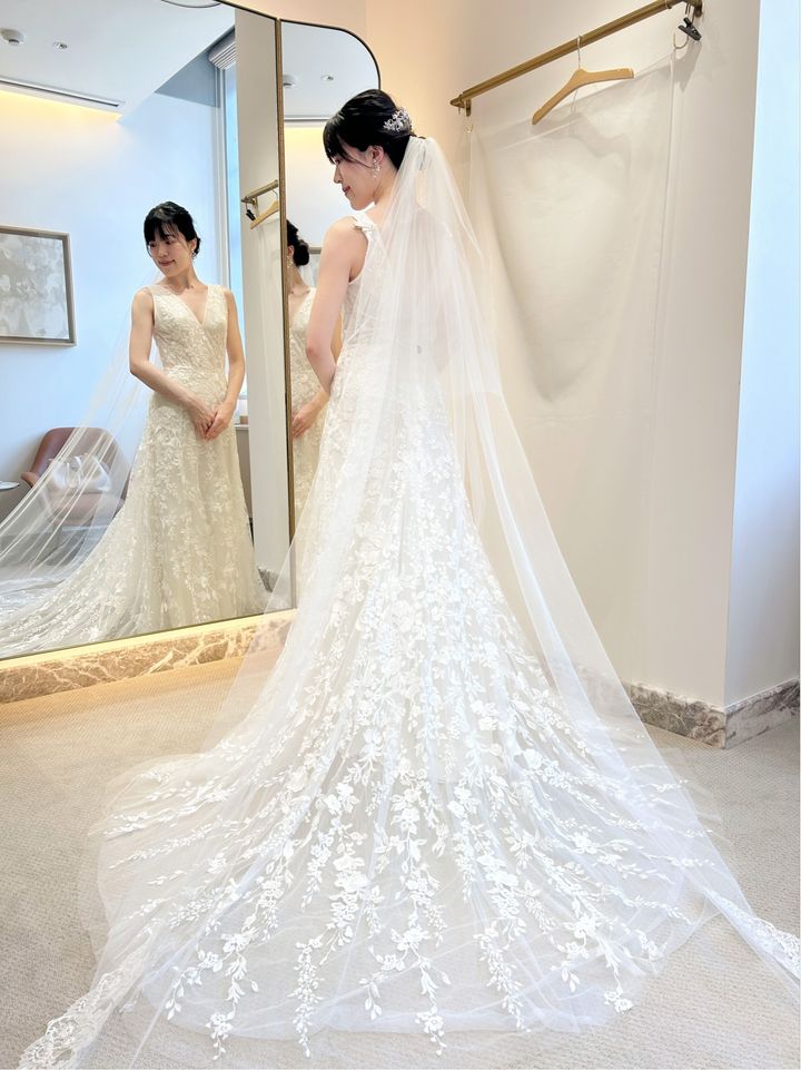 1着目に着させてもらったのはMonique Lhuillierの繊細でとても美しいウェディングドレス。
