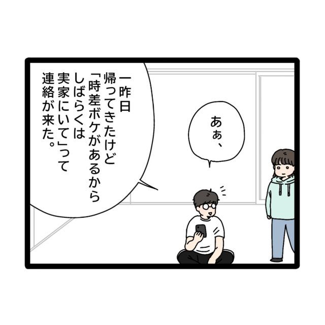 「あぁ、一昨日帰ってきたけど、『時差ボケがあるから、しばらくは実家にいて』って連絡が来た」