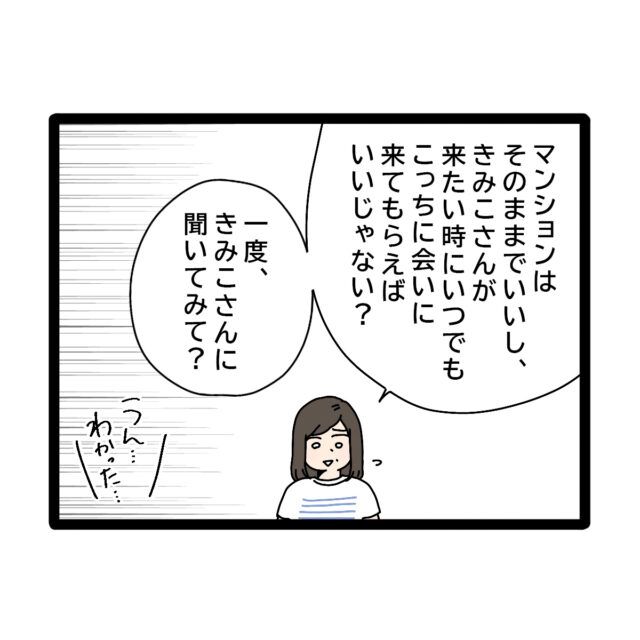 「マンションはそのままでいいし、きみこさんが来たい時にいつでもこっちに会いに来てもらえばいいじゃない?一度きみこさんに聞いてみて?」