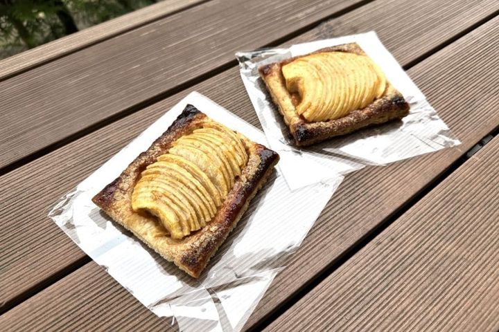 結局私が見た目で選んだのが「グランメルシー」(旧アンジェリック)のアップルパイ(¥460)。サックサクのパイ生地の底はカリカリにキャラメリゼしてあり、上には薄くスライスした生のりんごをのせ、そのまま焼き上げているのだとか。使用しているりんごは、地元農家からその時期の旬の品種を使っているそうで、甘すぎずしっかりと酸味も感じられ、とても美味しかったです。イートインはできないので、テイクアウトして公園でいただきました。