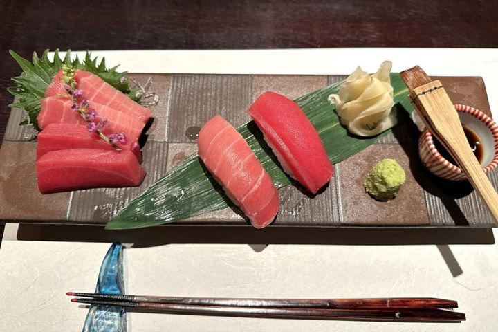 「大間のまぐろと花見蟹の会席」の割鮮、鮪のお造り、握り寿司、赤身、中トロ