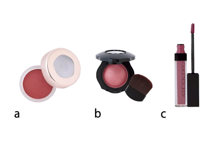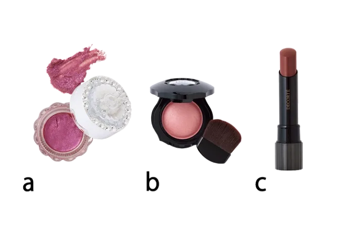 aを目頭側からまぶた全体に指でのばし、下まぶたのきわにはブラシで細く入れて囲み目に。bをほおに横長に入れて、鼻先にも小さく入れる。cを直塗りで唇全体にしっかりとつける。