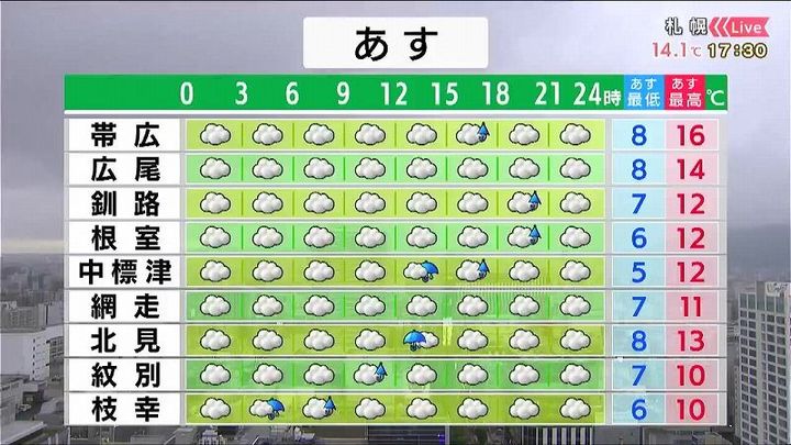 日付の変わる頃から道北や道央で雨の降るところがあり、あす5日(水)日中にかけても広く傘の出番となりそうです。