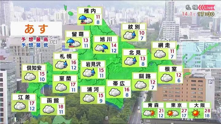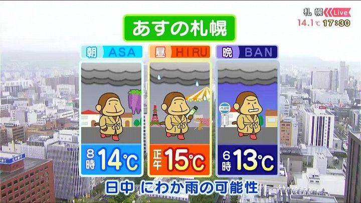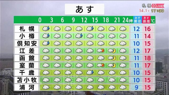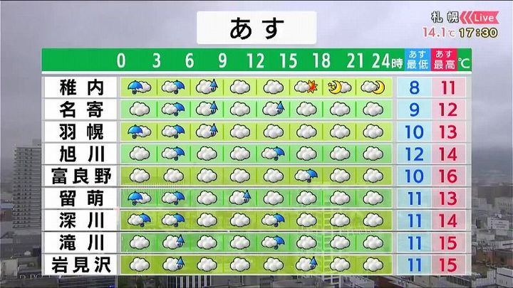 未明は札幌や小樽で雨が降り、昼前後もにわか雨がありそうです。お出かけには、折りたたみの傘があると安心です。
