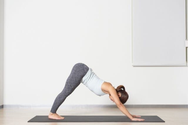 (1)四つん這いの姿勢からお尻を上げ、ひざを伸ばして「ダウンドッグ」の姿勢になる