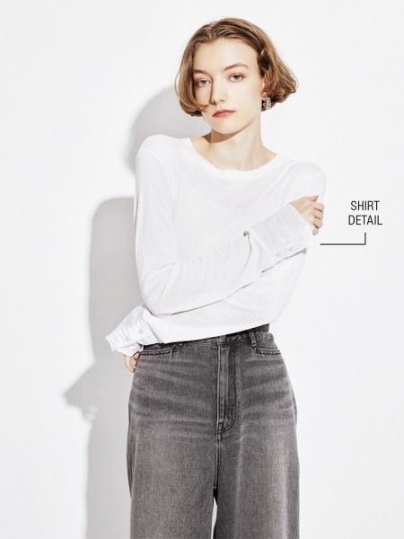 無地のロンTにきちんと感を補う、シャツライクなそで口の変化球。タックインしたときも埋もれないそでで、ささやかな着飾りがかなう。密着感のあるシルエットも大人っぽさをあと押し。