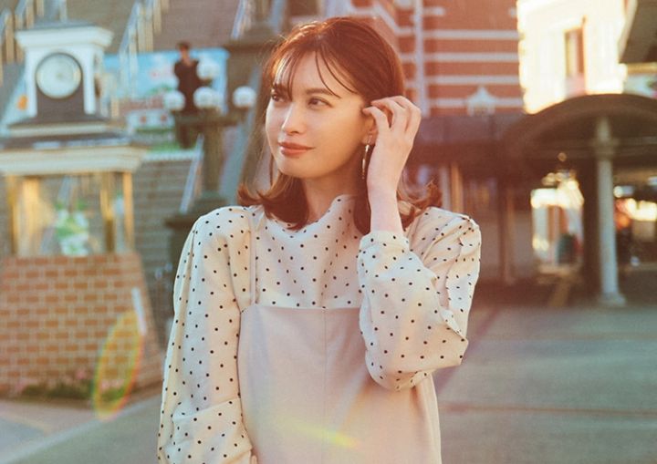 シンプルなサロペットには存在感のあるドットブラウスでコーデにアクセントを。ボリュームがあるのに華奢見えするパフスリーブが女性らしくてデートでも活躍!