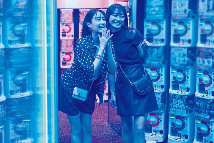 ガシャポンがズラーッと並ぶこの空間、ワクワクするっ。“ぶいあーる”ってやつにも興味あり!令和の遊びってハイテク!私が飛び越えちゃっている“平成”っていう時代も楽しかったらしい。40年の重みを感じる。[ミヅキ]バッグ¥39,600(ジョイ・グライソン/アルアバイル)ピアス¥66,000(ミチウィルウェイ/フォーティーンショールーム)バングル¥4,400(アビステ)[ウタ]ニット¥7,920(SNIDEL/SNIDEL ルミネ新宿2店)スカート¥17,600(アルページュストーリー/アルページュストーリープレスルーム)バッグ¥18,700(ダイアナ/ダイアナ銀座本店)イヤリング¥9,450バングル¥7,700(ともにアビステ)