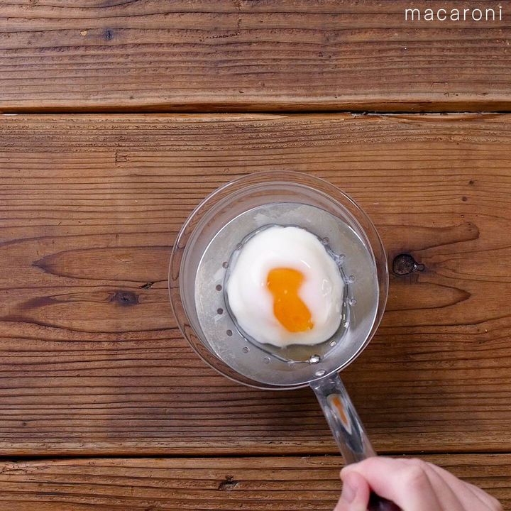 3: 加熱時間が足りない場合は、さらに5秒ずつ加熱します。卵白が白く固まったら穴あきおたまで取り出します。※これをもう一度繰り返します。
