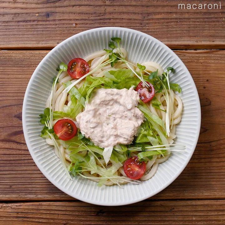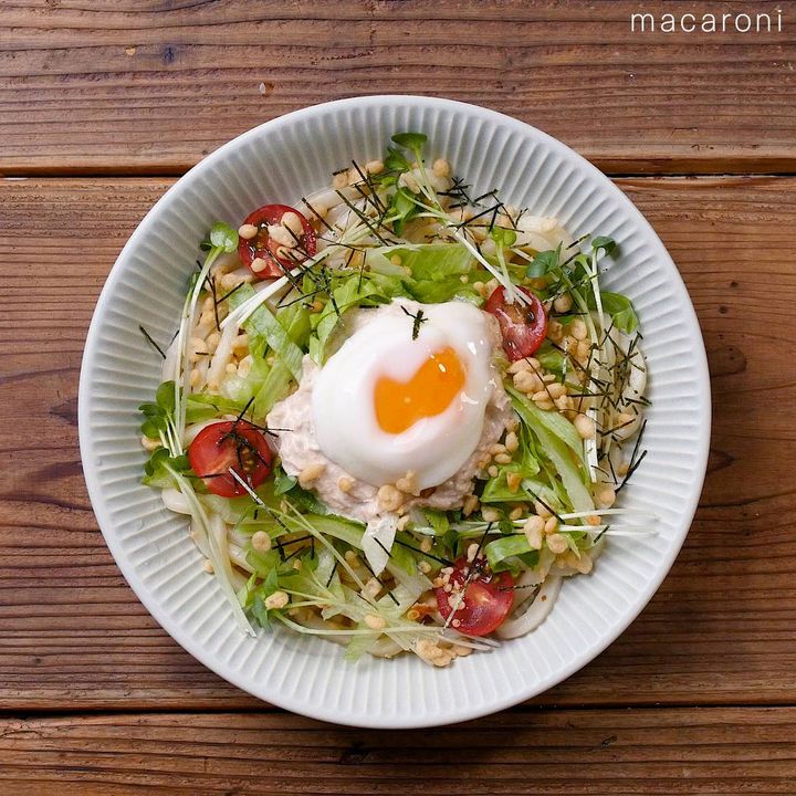 3. 温玉もレンジで作れる!ツナマヨ温玉サラダうどん