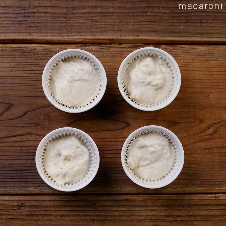4: ココットに入れたカップケーキ型に、7〜8分目まで流し入れます。