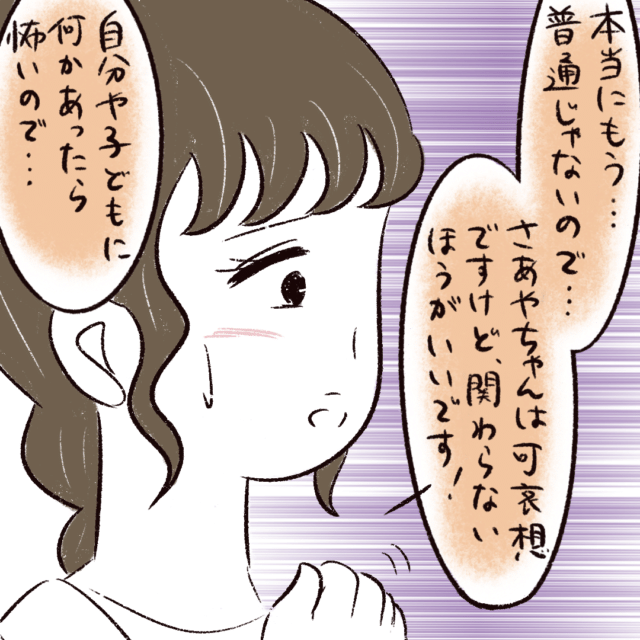 「本当にもう・・・普通じゃないので・・・さあやちゃんは可哀想ですけど、関わらないほうがいいです!自分や子どもに何かあったら怖いので・・・」
