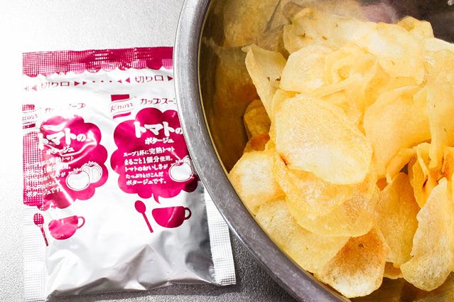 YouTube『タカタクのせっかちレシピ』で見つけた、手作りポテトチップスにコーンスープの粉末を振りかけるというアレンジ。試してみたところ、スープの粉末を使えば市販品にない味でも、気軽に作り出せることがわかりました。