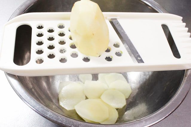 1.  じゃがいもの皮を剥き、スライサーで薄く切ります。