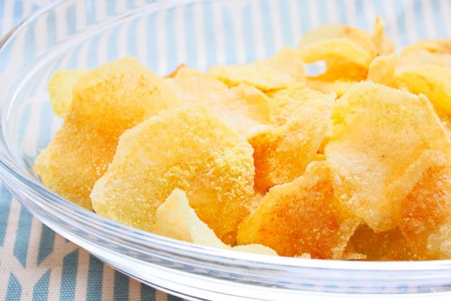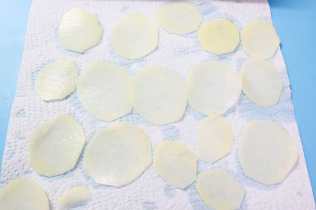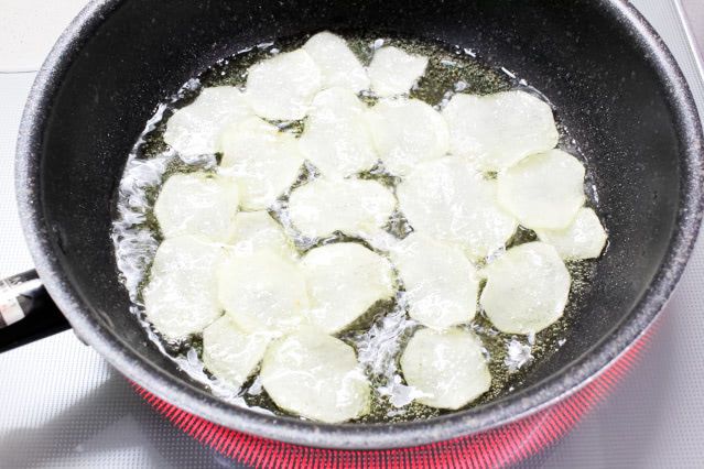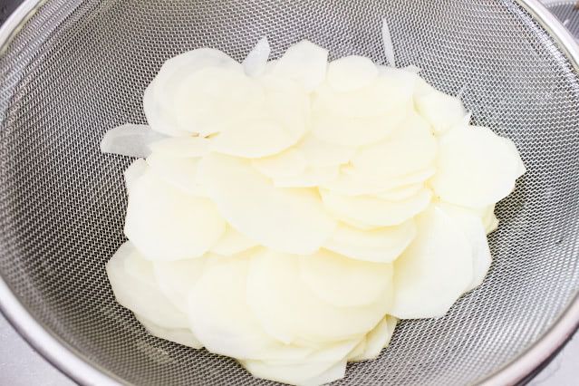 包丁で市販のポテトチップスくらいの薄さに切るのは難しいので、スライサーをお使いくださいね。