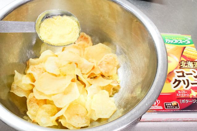 サクサクに揚がったポテトチップスに、コーンスープの粉末を振りかけます。今回は揚げたポテトチップスの半量に、大さじ1杯を振りかけ、仕上げました。ちなみに残りの半量のポテトチップスは味変用に取ってありますよ。