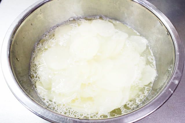 スライスしたじゃがいもを水に浸すと、でんぷんで水が白っぽくなりました。水を捨てて、もう一度水を張って軽く洗います。