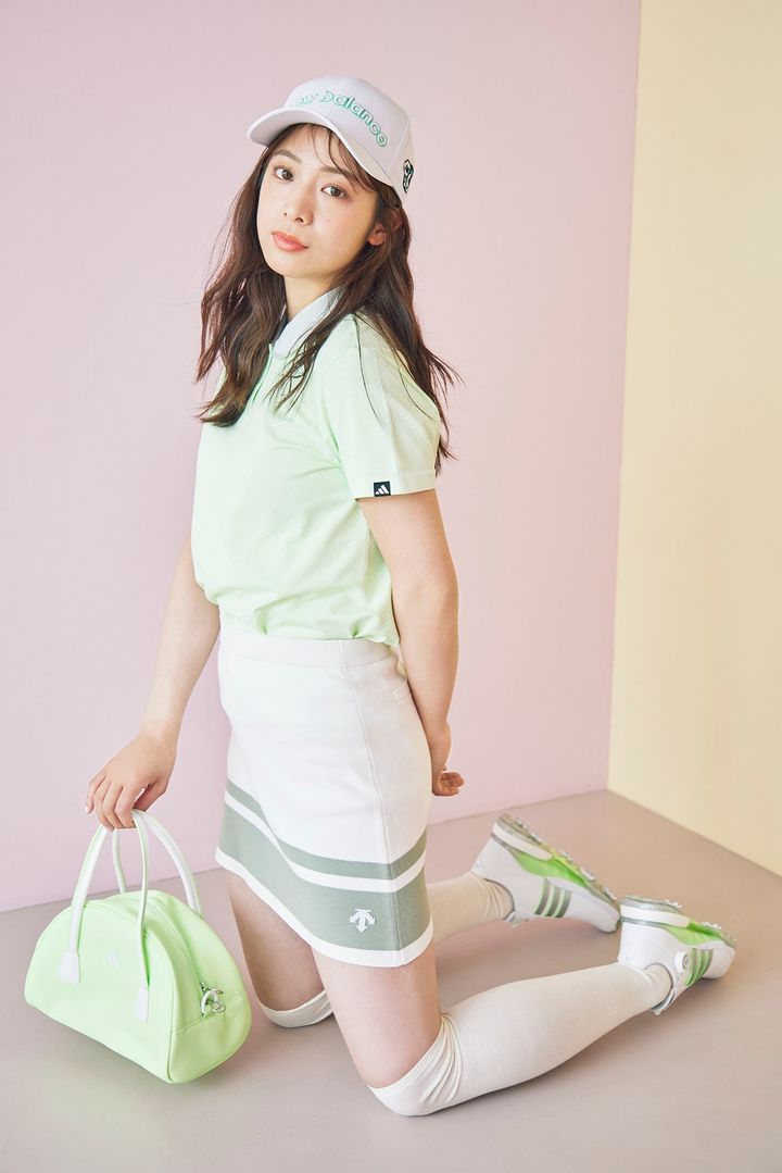 シャツ¥17,600、スカート¥20,900、サンバイザー¥6,600/デサントゴルフ シューズ¥11,990/ティゴラ