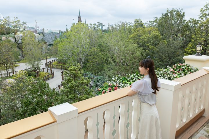 テラスからはファンタジースプリングスを一望でき、ディズニーファンタジーの世界観を堪能できます。