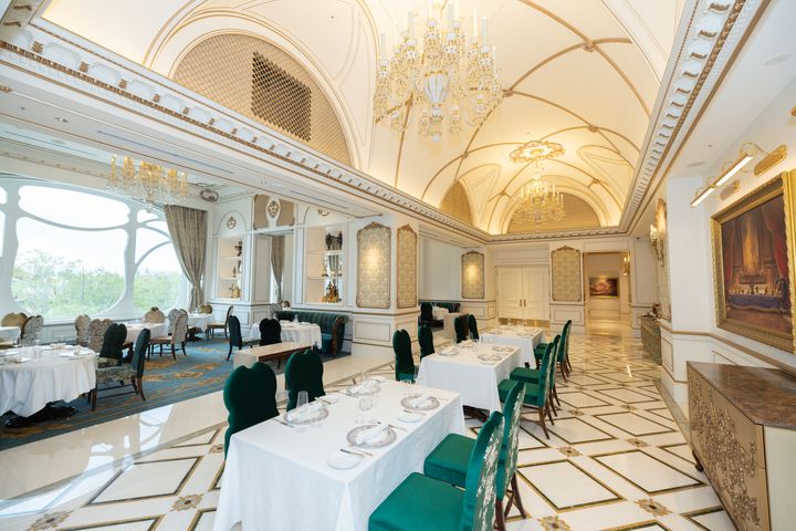 お食事は気品漂う最高級のダイニングホール「ラ・リベリュール」で。アール型の高い天井とクリスタルのシャンデリア、大理石風の床など豪華な設え。グランドシャトー宿泊ゲストだけが利用できます。