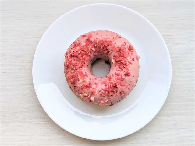 いちごチョコがたっぷりとコーティングされているドーナツです。お花が咲いているような華やかさがあります。
