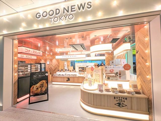 JR東京駅八重洲中央口横に2024年5月16日にオープンした「GOOD NEWS TOKYO 東京駅八重洲中央店」。栃木県那須町に本店を構え、「バターのいとこ」を中心に、「ブラウンチーズブラザー」「コナとスパイス」といったブランドを展開しています。