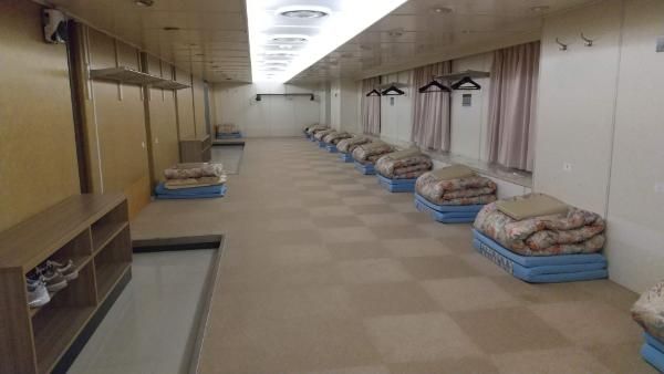 広々寝られます。行きの便ではこの広い船室を使っていたのは私たちを含めて4人でした。最安で快適ですが、女性しか利用できません。幼児でも男児は入室禁止なのでご注意下さい。