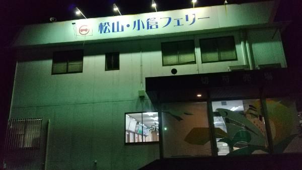 出発は松山観光港から。21時55分発の小倉港行きのフェリーです。 車と共に乗船なので、乗船手続きはターミナルとは別の建物になります。予約はネットや電話でできます。